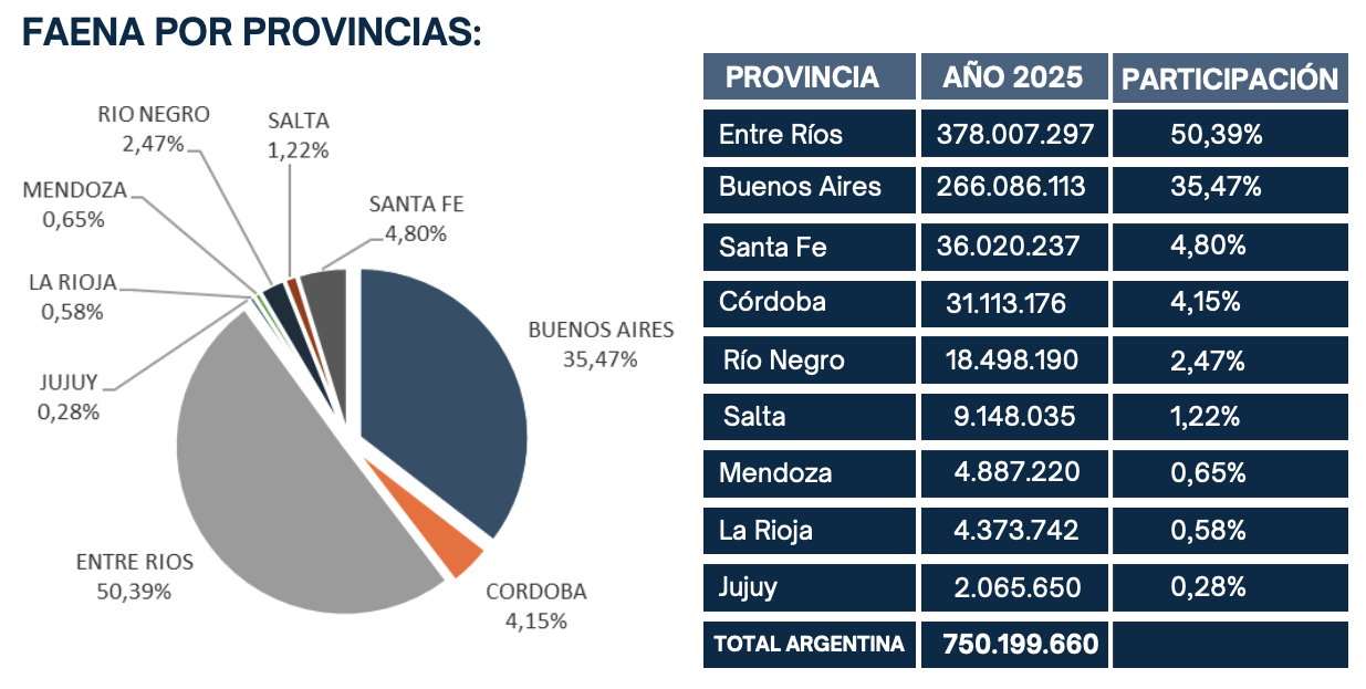 La faena total registrada por SENASA alcanzó 750.199.660 cabezas. La estructura territorial muestra una marcada concentración en la región centro: Entre Ríos lidera con el 50,39% del total nacional, seguida por Buenos Aires con 35,47%. Santa Fe (4,8%) y Córdoba (4,15%) completan el núcleo productivo, mientras que el resto de las provincias participan con porcentajes menores.