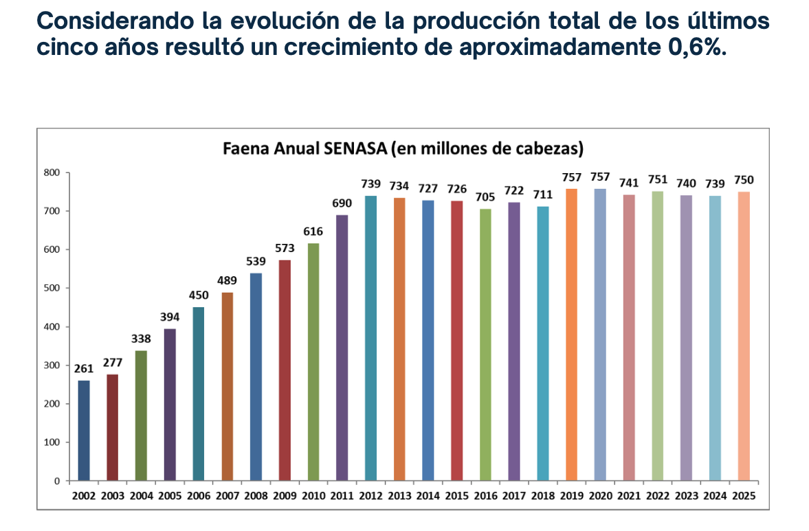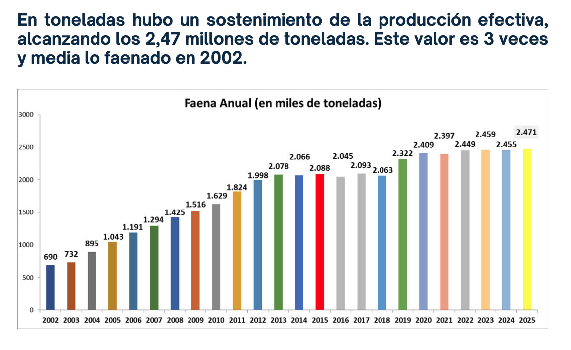 Medida en toneladas, la producción efectiva alcanzó 2,47 millones, volumen que multiplica por 3,5 lo registrado en 2002, evidenciando el salto tecnológico y de eficiencia logrado por la cadena en las últimas dos décadas.