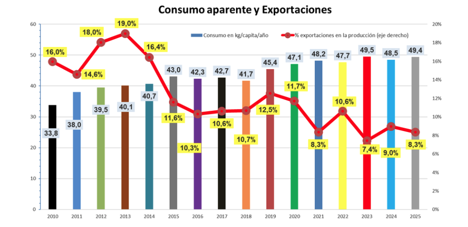 El consumo aparente se ubicó en 49,4 kg por habitante/año, con un incremento de 0,9 kg respecto de 2024. El dato confirma la estabilidad del consumo en el último quinquenio y ratifica la centralidad del pollo en la dieta argentina.