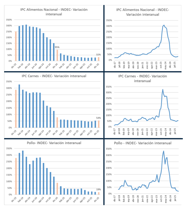 En un contexto macroeconómico de desaceleración inflacionaria (31,55% anual en 2025 frente al 117,76% en 2024 y 211,4% en 2023), el comportamiento del precio del pollo mostró un desempeño diferencial. Mientras el rubro Alimentos creció 32% y el capítulo Carnes 54%, el pollo entero al consumidor registró un aumento del 19%, quedando significativamente por debajo de la inflación general.