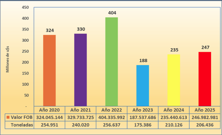 Las exportaciones totalizaron 206.436 toneladas en 2025. En volumen, se registró una leve caída del 1,8%, pero en valor FOB hubo un crecimiento del 4,9%, reflejando mejoras en precios y composición de destinos.