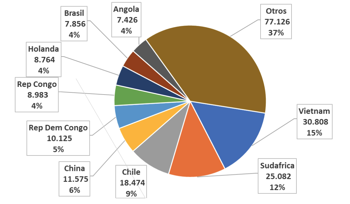 Argentina exportó a 76 países. Los principales destinos fueron Vietnam (15%), Sudáfrica (12%), Chile (9%), China (6%) y República Democrática del Congo (5%).