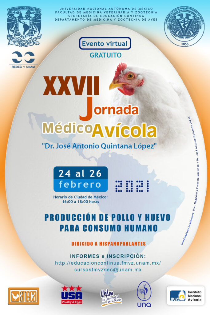 La Facultad de Medicina Veterinaria y Zootecnia de la Universidad Autónoma de México tiene el placer de invitarlo a la XXVII Jornada Médico Avícola “Dr. José Antonio Quintana López” del 24 al 26 de febrero de 2021, en un evento virtual gratuito que se desarrollará de las 16:00 a las 18:00 horas, hora de la Ciudad de México, dirigida a hispanoparlantes. El tema principal será la «Producción de pollo y huevo para consumo humano».