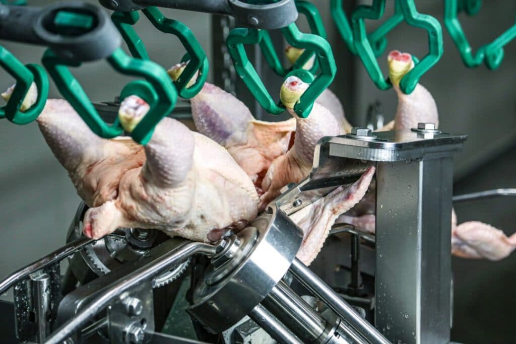 El cortador de alas High Yield Pro de Meyn se ajusta de forma individual a cada ave de diferentes pesos y tamaños de pollos, y mejora el despiece.