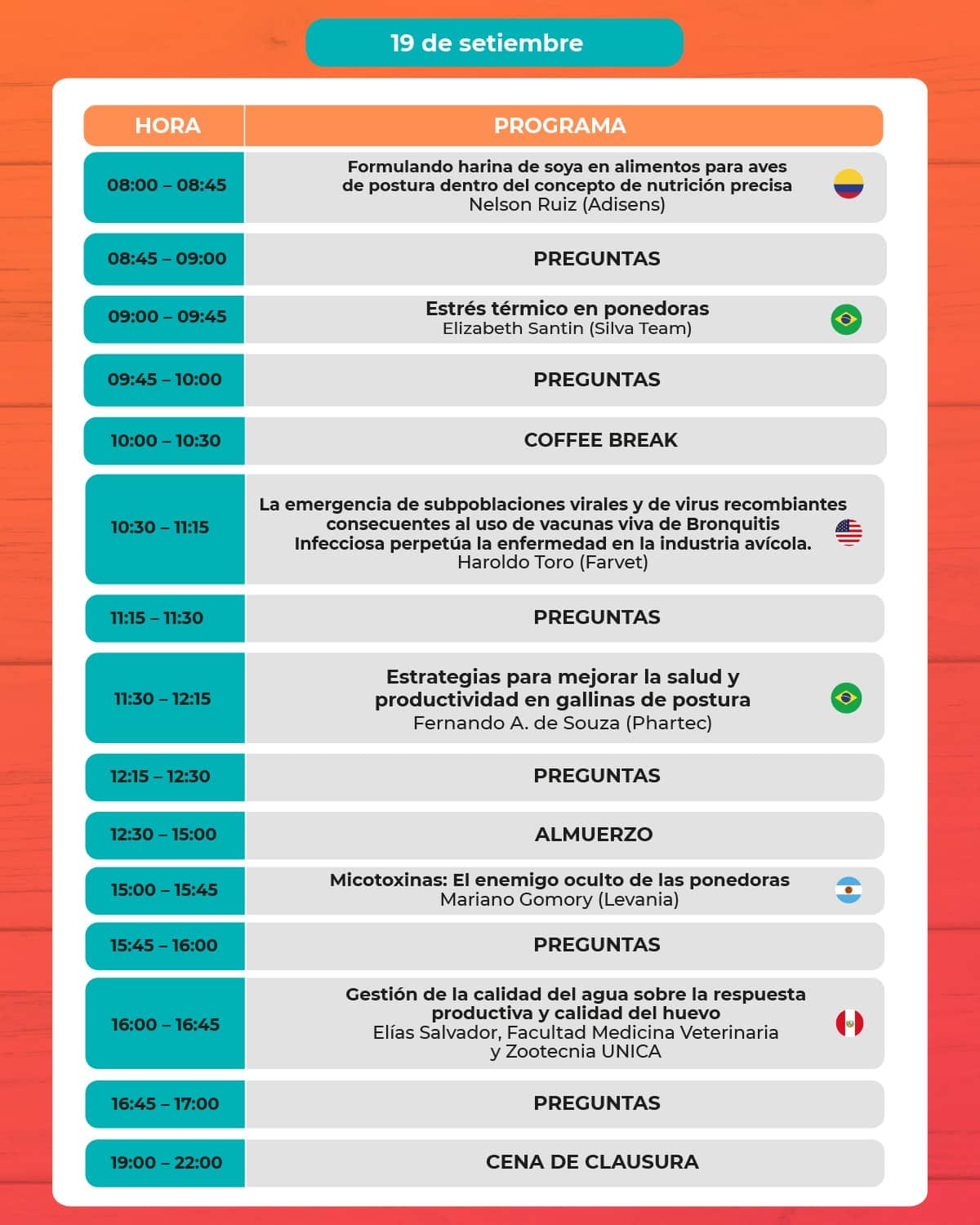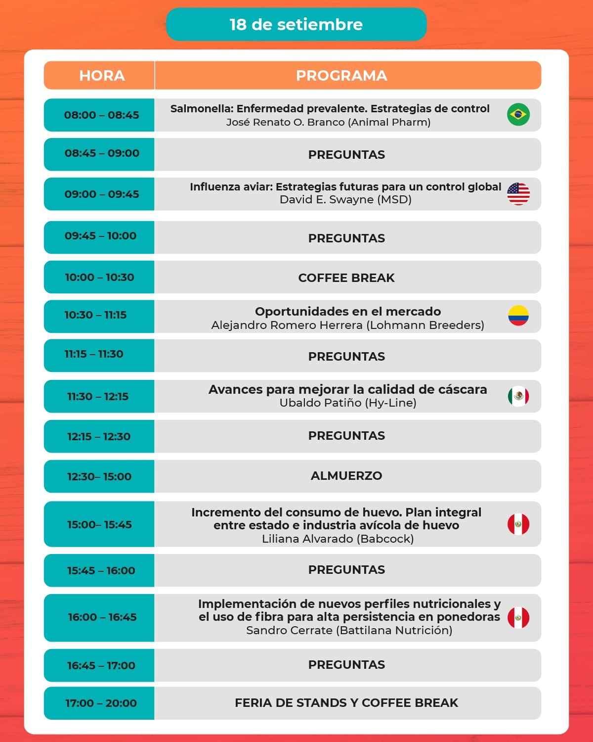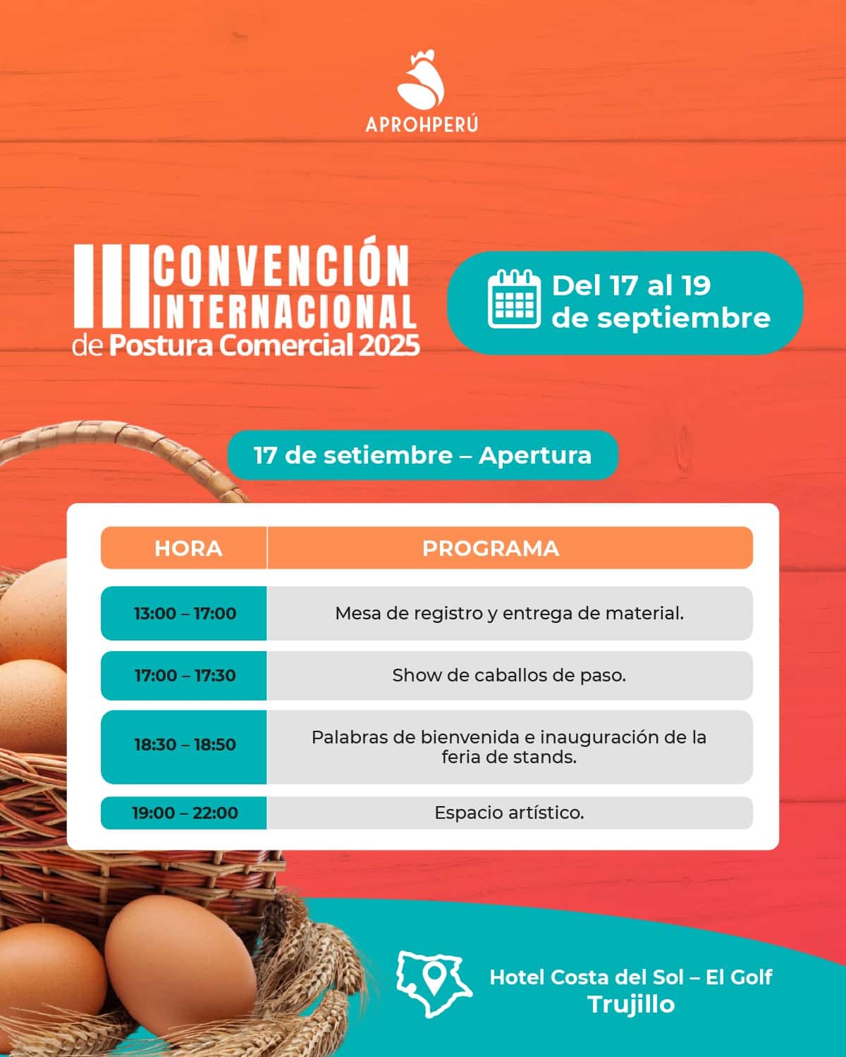Al año siguiente se hizo en Arequipa y este año se realizará en Trujillo los días 17, 18, 19 de septiembre en el Hotel Costa del Sol. En esta III Convención Internacional de Postura Comercial harán énfasis en temas que acabamos de comentar como el de promocionar el consumo de huevo, de información nutricional y de fortalecer las campañas. Además, habrá 13 ponencias sobre sanidad, producción, nutrición y marketing . También se llevará a cabo una feria comercial de 42 stands.