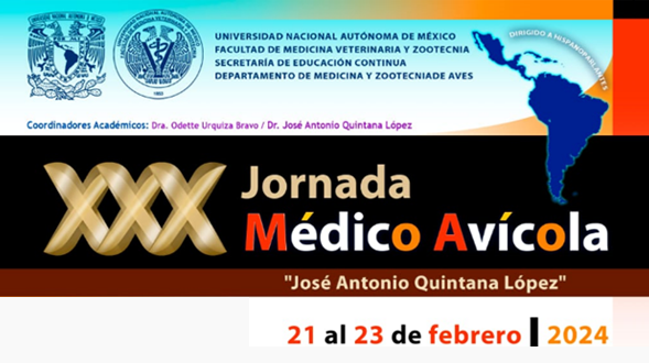 La Facultad de Medicina Veterinaria y Zootecnia de la UNAM celebra este próximo año la 30ª edición de la Jornada Médico Avícola “José Antonio Quintana López, la cual se llevará a cabo del 21 al 23 de febrero de 2024.