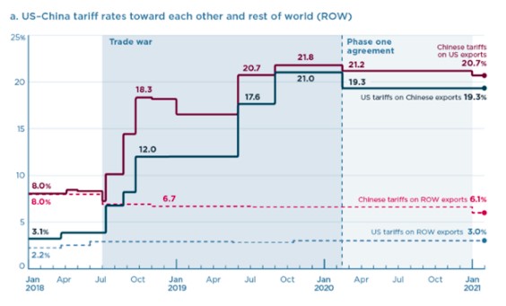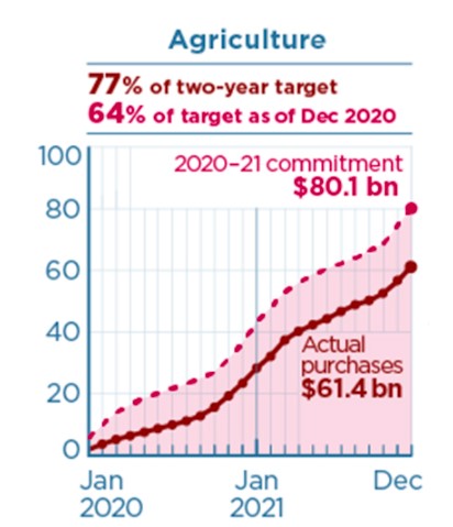 Debido en parte a la pandemia de COVID-19 e impactos relacionados en la demanda global, China incumplió su compromiso en aproximadamente un 30 %. En 2020, las exportaciones agrícolas de EUA a China totalizaron $26 400 millones, un incremento de $12 600 millones desde 2019. En 2021, las exportaciones agrícolas alcanzaron un récord de $33 000 millones, 25 % más que en 2020.