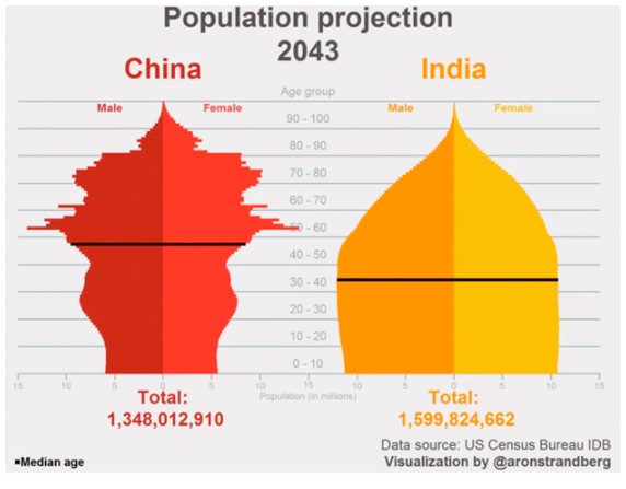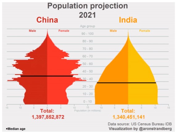 • Estados Unidos alberga 329 millones de personas, mientras que China alberga a 1.400 millones.