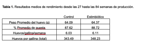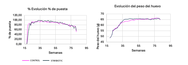 De acuerdo con las directrices nutricionales del cliente, la inclusión de butirato en la dieta comenzó en la semana 27, momento que se estableció como el inicio del ensayo (grupo control). En paralelo, el producto estimbiótico se incorporó al otro tratamiento (grupo estimbiótico), quitando el butirato y la carbohidrasa. La duración del ensayo fue de 57 semanas. El consumo medio fue de 115 g/día. Durante las primeras semanas, el grupo Estimbiótico estuvo expuesto a un factor sanitario externo que ocasionó una mortalidad inicial del 6,1 %, en comparación con el 1,1 % del grupo Control. A pesar de este desafío sanitario, al final del ensayo las aves suplementadas con el producto estimbiótico mostraron un rendimiento ligeramente superior en cuanto a la tasa de puesta y el peso de los huevos (tabla 1).