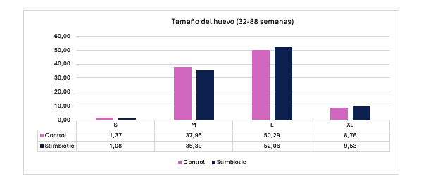 En cuanto al peso del huevo, el tratamiento con estimbiótico mostró valores superiores en las etapas tempranas, a partir de aproximadamente la semana 35, en comparación con el tratamiento control Además, los huevos se clasificaron por tamaño en categorías S, M, L y XL. Cada semana se midieron treinta huevos. El porcentaje correspondiente a cada tamaño fue similar entre tratamientos, aunque se observó una proporción ligeramente superior de huevos de tamaño L y XL en el tratamiento con estimbiótico.