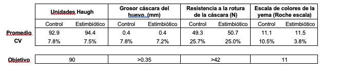 Tabla 3. Promedio de los parámetros de calidad del huevo (Unidades Haugh, grosor de la cáscara, resistencia a la rotura, color de la yema) y coeficiente de variación (CV) para el grupo Control y el grupo con Estimbiótico.